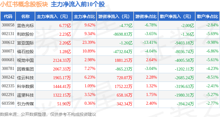 从资金流向上来看,当日小红书概念股板块主力资金净流入11.18亿元,游资资金净流出7.14亿元,散户资金净流出4.03亿元。小红书概念股板块个股资金流向见下表: