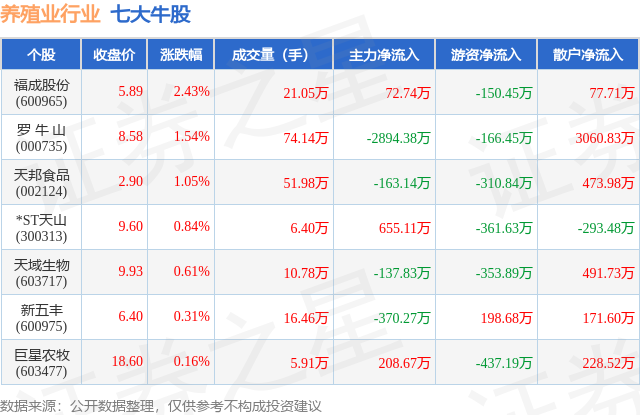 个股表现方面,养殖业行业当日领涨股为福成股份(600965),该股当日报收5.89,上涨2.43%,成交量21.05万,主力资金净流入72.74万元。罗 牛 山(000735)以上涨1.54%紧随其后,该股当日成交量74.14万,主力资金净流出2894.38万元。除此之外,天邦食品(002124)、*ST天山(300313)、天域生物(603717)均进入当日牛股之列。具体个股列表见下表:
