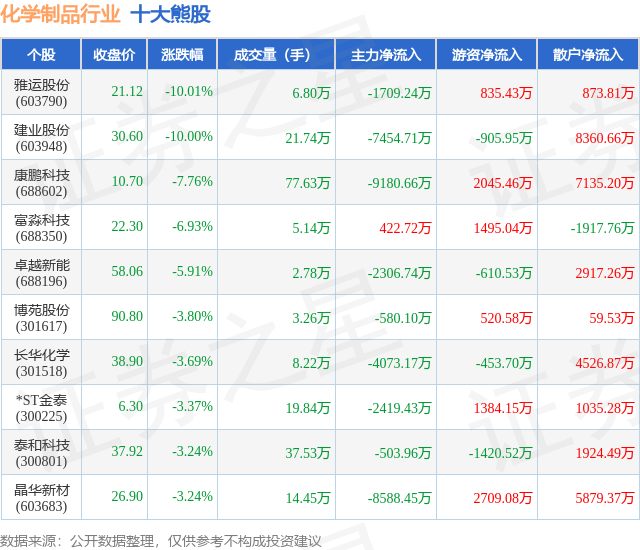 个股表现方面,化学制品行业当日领跌股为雅运股份(603790),该股当日报收21.12,下跌10.01%,成交量6.8万,主力资金净流出1709.24万元。建业股份(603948)以下跌10.0%紧随其后,该股当日成交量21.74万,主力资金净流出7454.71万元。除此之外,康鹏科技(688602)、富淼科技(688350)、卓越新能(688196)均进入当日熊股之列。具体个股列表见下表: