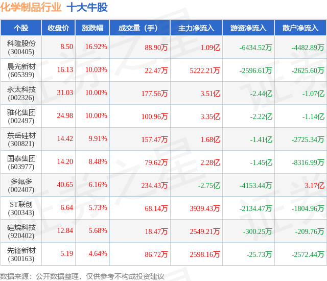 个股表现方面,化学制品行业当日领涨股为科隆股份(300405),该股当日报收8.5,上涨16.92%,成交量88.9万,主力资金净流入1.09亿元。晨光新材(605399)以上涨10.03%紧随其后,该股当日成交量22.47万,主力资金净流入5222.21万元。除此之外,永太科技(002326)、雅化集团(002497)、东岳硅材(300821)均进入当日牛股之列。具体个股列表见下表: