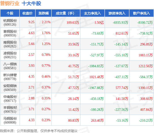 个股表现方面,普钢行业当日领涨股为杭钢股份(600126),该股当日报收9.25,上涨2.21%,成交量109.63万,主力资金净流入1.5亿元。首钢股份(000959)以上涨1.76%紧随其后,该股当日成交量51.65万,主力资金净流出73.69万元。除此之外,南钢股份(600282)、凌钢股份(600231)、八一钢铁(600581)均进入当日牛股之列。具体个股列表见下表: