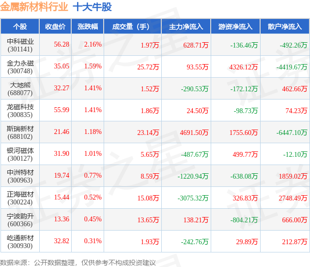 个股表现方面,金属新材料行业当日领涨股为中科磁业(301141),该股当日报收56.28,上涨2.16%,成交量1.97万,主力资金净流入628.71万元。金力永磁(300748)以上涨1.59%紧随其后,该股当日成交量25.72万,主力资金净流入93.55万元。除此之外,大地熊(688077)、龙磁科技(300835)、斯瑞新材(688102)均进入当日牛股之列。具体个股列表见下表: