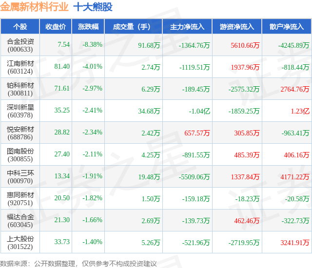 个股表现方面,金属新材料行业当日领跌股为合金投资(000633),该股当日报收7.54,下跌8.38%,成交量91.68万,主力资金净流出1364.76万元。江南新材(603124)以下跌4.01%紧随其后,该股当日成交量2.74万,主力资金净流出1119.51万元。除此之外,铂科新材(300811)、深圳新星(603978)、悦安新材(688786)均进入当日熊股之列。具体个股列表见下表:
