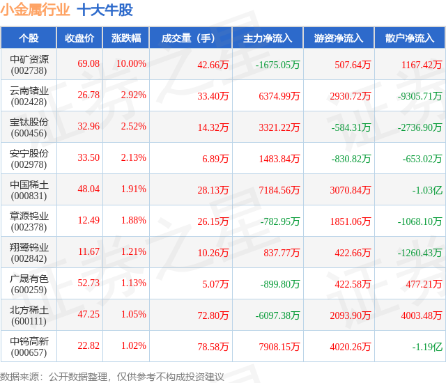 个股表现方面,小金属行业当日领涨股为中矿资源(002738),该股当日报收69.08,上涨10.0%,成交量42.66万,主力资金净流出1675.05万元。云南锗业(002428)以上涨2.92%紧随其后,该股当日成交量33.4万,主力资金净流入6374.99万元。除此之外,宝钛股份(600456)、安宁股份(002978)、中国稀土(000831)均进入当日牛股之列。具体个股列表见下表: