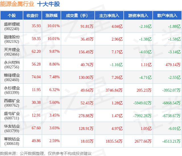 个股表现方面,能源金属行业当日领涨股为盛新锂能(002240),该股当日报收35.93,上涨10.01%,成交量91.81万,主力资金净流入4.04亿元。融捷股份(002192)以上涨10.01%紧随其后,该股当日成交量36.49万,主力资金净流入2.96亿元。除此之外,天齐锂业(002466)、永兴材料(002756)、赣锋锂业(002460)均进入当日牛股之列。具体个股列表见下表: