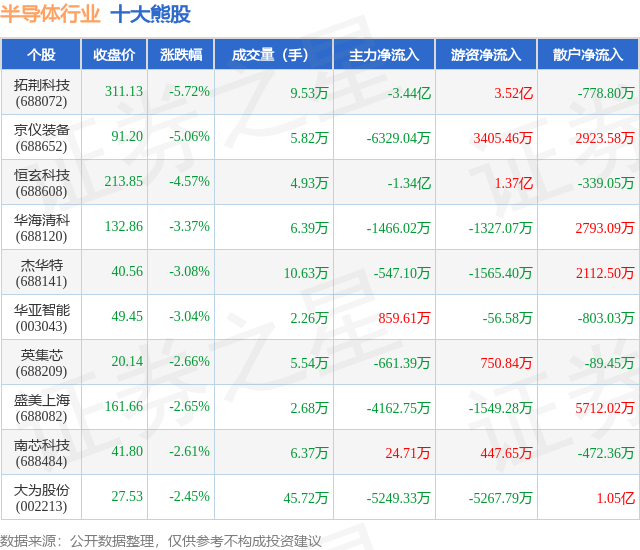 个股表现方面,半导体行业当日领跌股为拓荆科技(688072),该股当日报收311.13,下跌5.72%,成交量9.53万,主力资金净流出3.44亿元。京仪装备(688652)以下跌5.06%紧随其后,该股当日成交量5.82万,主力资金净流出6329.04万元。除此之外,恒玄科技(688608)、华海清科(688120)、杰华特(688141)均进入当日熊股之列。具体个股列表见下表: