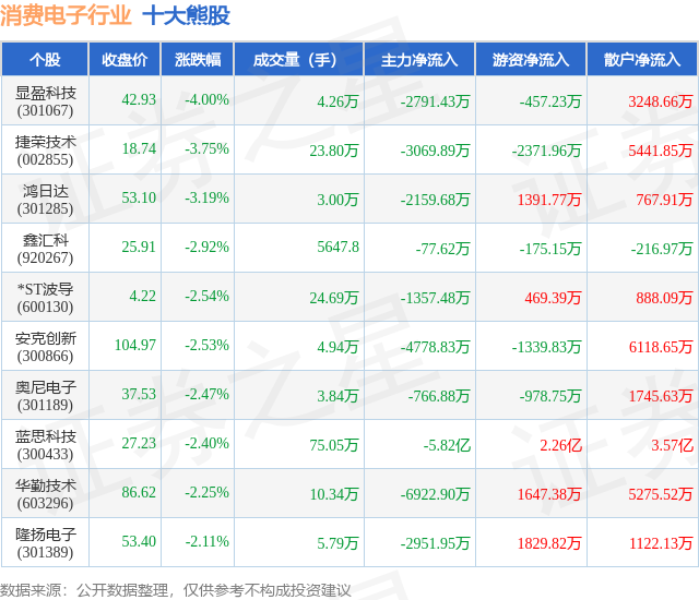 个股表现方面,消费电子行业当日领跌股为显盈科技(301067),该股当日报收42.93,下跌4.0%,成交量4.26万,主力资金净流出2791.43万元。捷荣技术(002855)以下跌3.75%紧随其后,该股当日成交量23.8万,主力资金净流出3069.89万元。除此之外,鸿日达(301285)、鑫汇科(920267)、*ST波导(600130)均进入当日熊股之列。具体个股列表见下表: