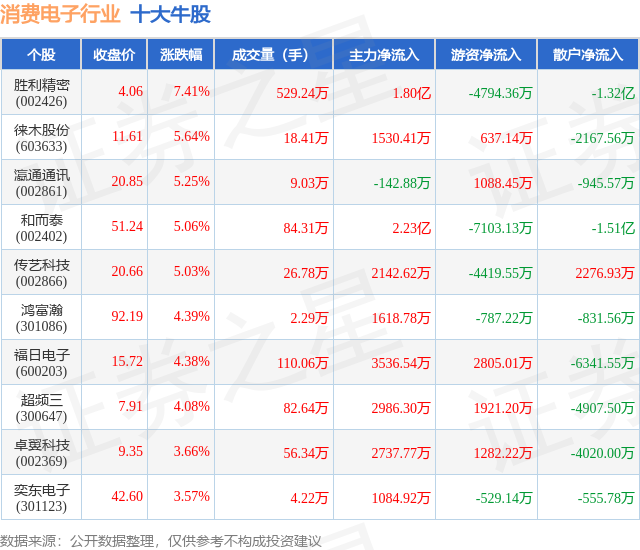 个股表现方面,消费电子行业当日领涨股为胜利精密(002426),该股当日报收4.06,上涨7.41%,成交量529.24万,主力资金净流入1.8亿元。徕木股份(603633)以上涨5.64%紧随其后,该股当日成交量18.41万,主力资金净流入1530.41万元。除此之外,瀛通通讯(002861)、和而泰(002402)、传艺科技(002866)均进入当日牛股之列。具体个股列表见下表: