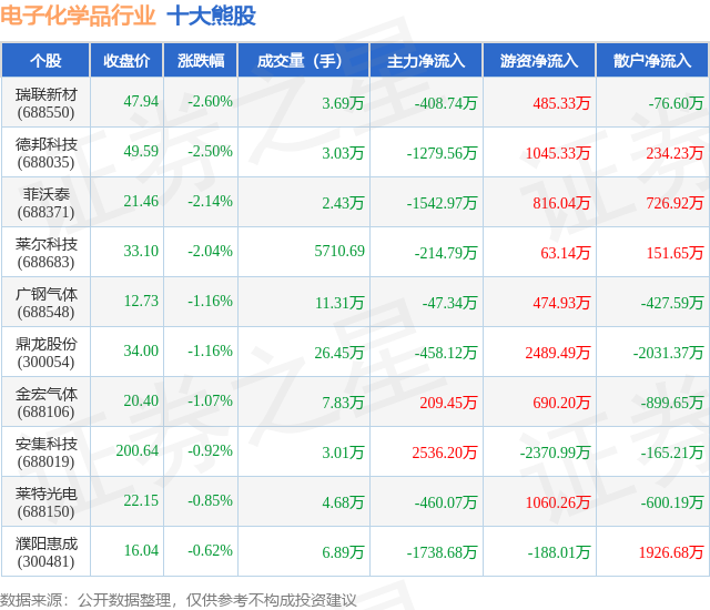 个股表现方面,电子化学品行业当日领跌股为瑞联新材(688550),该股当日报收47.94,下跌2.6%,成交量3.69万,主力资金净流出408.74万元。德邦科技(688035)以下跌2.5%紧随其后,该股当日成交量3.03万,主力资金净流出1279.56万元。除此之外,菲沃泰(688371)、莱尔科技(688683)、广钢气体(688548)均进入当日熊股之列。具体个股列表见下表: