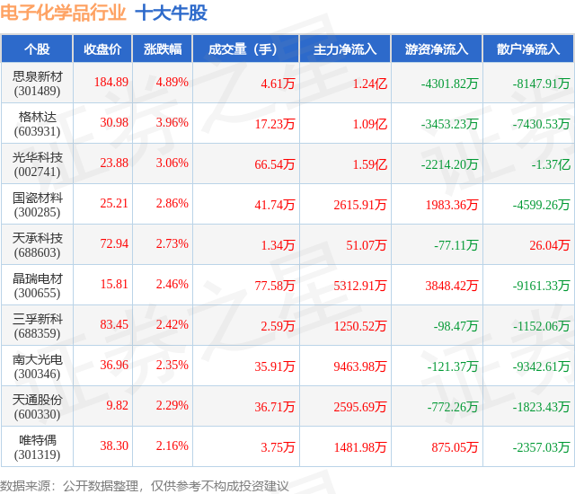 个股表现方面,电子化学品行业当日领涨股为思泉新材(301489),该股当日报收184.89,上涨4.89%,成交量4.61万,主力资金净流入1.24亿元。格林达(603931)以上涨3.96%紧随其后,该股当日成交量17.23万,主力资金净流入1.09亿元。除此之外,光华科技(002741)、国瓷材料(300285)、天承科技(688603)均进入当日牛股之列。具体个股列表见下表: