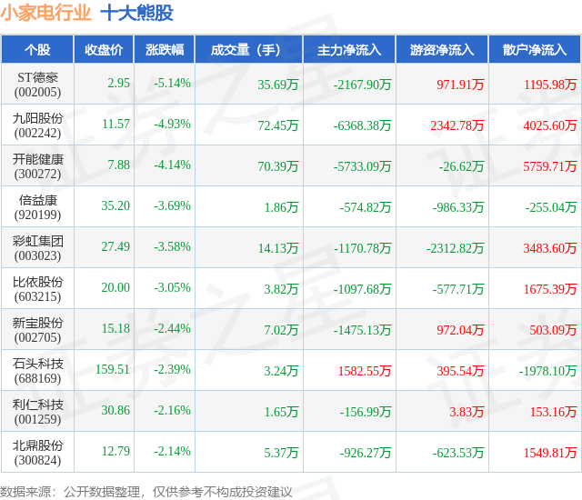 个股表现方面,小家电行业当日领跌股为ST德豪(002005),该股当日报收2.95,下跌5.14%,成交量35.69万,主力资金净流出2167.9万元。九阳股份(002242)以下跌4.93%紧随其后,该股当日成交量72.45万,主力资金净流出6368.38万元。除此之外,开能健康(300272)、倍益康(920199)、彩虹集团(003023)均进入当日熊股之列。具体个股列表见下表: