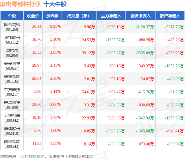 个股表现方面,家电零部件行业当日领涨股为联合精密(001268),该股当日报收36.14,上涨9.95%,成交量9.96万,主力资金净流入6338.1万元。华翔股份(603112)以上涨5.1%紧随其后,该股当日成交量24.53万,主力资金净流出1505.57万元。除此之外,星帅尔(002860)、春光科技(603657)、瑞德智能(301135)均进入当日牛股之列。具体个股列表见下表: