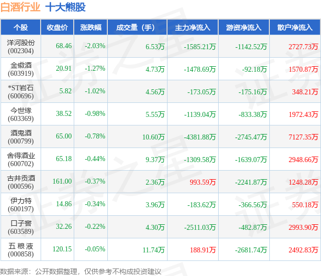 个股表现方面,白酒行业当日领跌股为洋河股份(002304),该股当日报收68.46,下跌2.03%,成交量6.53万,主力资金净流出1585.21万元。金徽酒(603919)以下跌1.27%紧随其后,该股当日成交量4.73万,主力资金净流出1478.69万元。除此之外,*ST岩石(600696)、今世缘(603369)、酒鬼酒(000799)均进入当日熊股之列。具体个股列表见下表:
