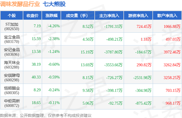 个股表现方面,调味发酵品行业当日领跌股为ST加加(002650),该股当日报收7.19,下跌4.26%,成交量8.52万,主力资金净流出1791.33万元。宝立食品(603170)以下跌2.38%紧随其后,该股当日成交量4.5万,主力资金净流出498.21万元。除此之外,安记食品(603696)、海天味业(603288)、安琪酵母(600298)均进入当日熊股之列。具体个股列表见下表: