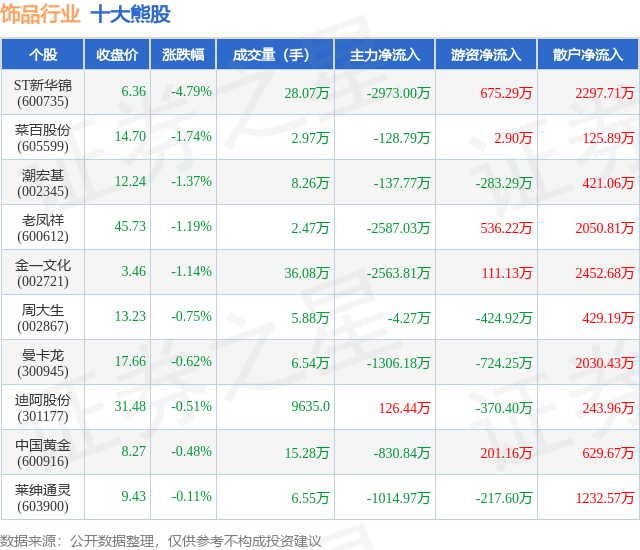 个股表现方面,饰品行业当日领跌股为ST新华锦(600735),该股当日报收6.36,下跌4.79%,成交量28.07万,主力资金净流出2973.0万元。菜百股份(605599)以下跌1.74%紧随其后,该股当日成交量2.97万,主力资金净流出128.79万元。除此之外,潮宏基(002345)、老凤祥(600612)、金一文化(002721)均进入当日熊股之列。具体个股列表见下表: