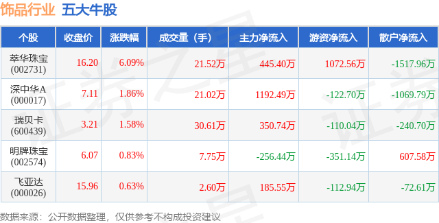 个股表现方面,饰品行业当日领涨股为萃华珠宝(002731),该股当日报收16.2,上涨6.09%,成交量21.52万,主力资金净流入445.4万元。深中华A(000017)以上涨1.86%紧随其后,该股当日成交量21.02万,主力资金净流入1192.49万元。除此之外,瑞贝卡(600439)、明牌珠宝(002574)、飞亚达(000026)均进入当日牛股之列。具体个股列表见下表:
