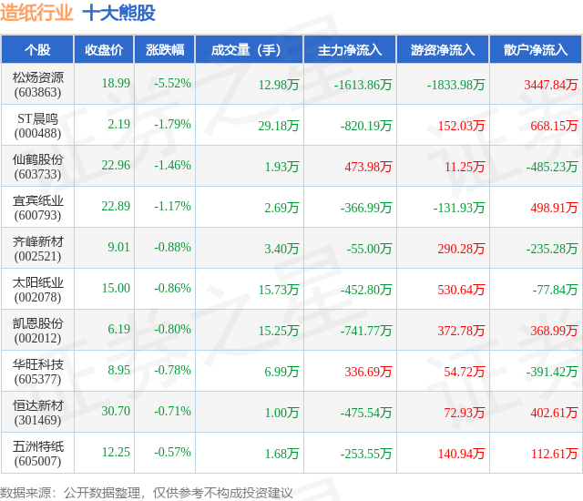 个股表现方面,造纸行业当日领跌股为松炀资源(603863),该股当日报收18.99,下跌5.52%,成交量12.98万,主力资金净流出1613.86万元。ST晨鸣(000488)以下跌1.79%紧随其后,该股当日成交量29.18万,主力资金净流出820.19万元。除此之外,仙鹤股份(603733)、宜宾纸业(600793)、齐峰新材(002521)均进入当日熊股之列。具体个股列表见下表: