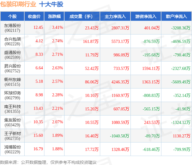 个股表现方面,包装印刷行业当日领涨股为东港股份(002117),该股当日报收12.45,上涨3.41%,成交量23.43万,主力资金净流入2807.31万元。合兴包装(002228)以上涨2.74%紧随其后,该股当日成交量161.87万,主力资金净流入5573.17万元。除此之外,盛通股份(002599)、昇兴股份(002752)、衢州东峰(601515)均进入当日牛股之列。具体个股列表见下表: