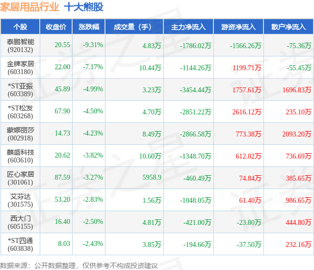 个股表现方面,家居用品行业当日领跌股为泰鹏智能(920132),该股当日报收20.55,下跌9.31%,成交量4.83万,主力资金净流出1786.02万元。金牌家居(603180)以下跌7.17%紧随其后,该股当日成交量10.44万,主力资金净流出1144.26万元。除此之外,*ST亚振(603389)、*ST松发(603268)、蒙娜丽莎(002918)均进入当日熊股之列。具体个股列表见下表: