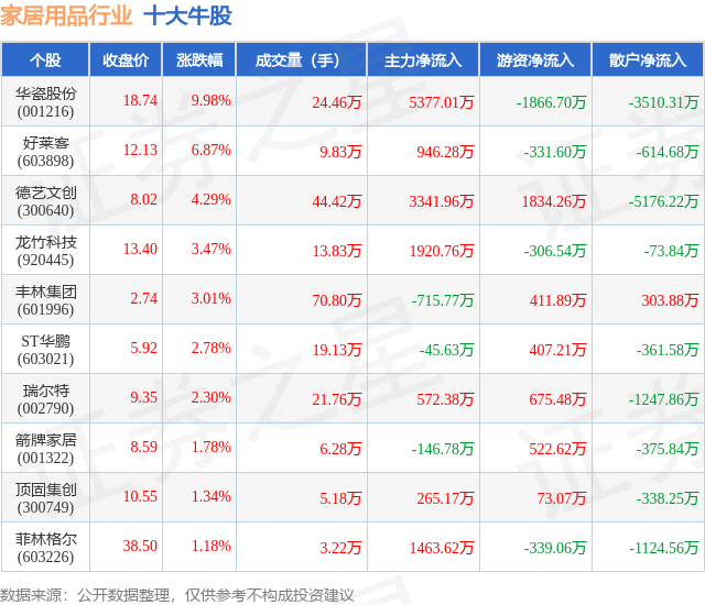 个股表现方面,家居用品行业当日领涨股为华瓷股份(001216),该股当日报收18.74,上涨9.98%,成交量24.46万,主力资金净流入5377.01万元。好莱客(603898)以上涨6.87%紧随其后,该股当日成交量9.83万,主力资金净流入946.28万元。除此之外,德艺文创(300640)、龙竹科技(920445)、丰林集团(601996)均进入当日牛股之列。具体个股列表见下表: