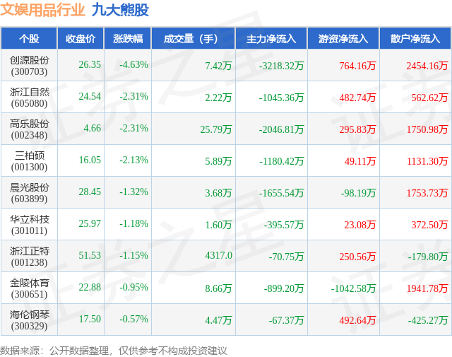 个股表现方面,文娱用品行业当日领跌股为创源股份(300703),该股当日报收26.35,下跌4.63%,成交量7.42万,主力资金净流出3218.32万元。浙江自然(605080)以下跌2.31%紧随其后,该股当日成交量2.22万,主力资金净流出1045.36万元。除此之外,高乐股份(002348)、三柏硕(001300)、晨光股份(603899)均进入当日熊股之列。具体个股列表见下表: