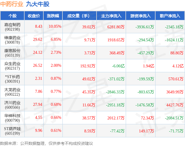 个股表现方面,中药行业当日领涨股为嘉应制药(002198),该股当日报收8.43,上涨10.05%,成交量39.02万,主力资金净流入6281.8万元。维康药业(300878)以上涨6.85%紧随其后,该股当日成交量9.71万,主力资金净流入1918.65万元。除此之外,康惠股份(603139)、众生药业(002317)、*ST长药(300391)均进入当日牛股之列。具体个股列表见下表: