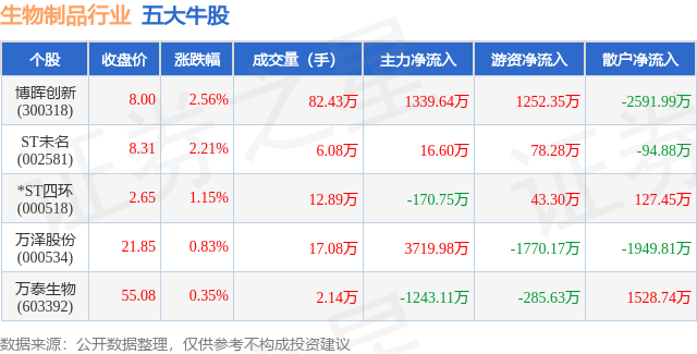 个股表现方面,生物制品行业当日领涨股为博晖创新(300318),该股当日报收8.0,上涨2.56%,成交量82.43万,主力资金净流入1339.64万元。ST未名(002581)以上涨2.21%紧随其后,该股当日成交量6.08万,主力资金净流入16.6万元。除此之外,*ST四环(000518)、万泽股份(000534)、万泰生物(603392)均进入当日牛股之列。具体个股列表见下表: