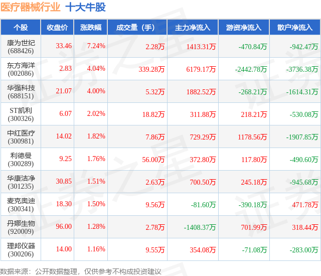 个股表现方面,医疗器械行业当日领涨股为康为世纪(688426),该股当日报收33.46,上涨7.24%,成交量2.28万,主力资金净流入1413.31万元。东方海洋(002086)以上涨4.04%紧随其后,该股当日成交量339.28万,主力资金净流入6179.17万元。除此之外,华强科技(688151)、ST凯利(300326)、中红医疗(300981)均进入当日牛股之列。具体个股列表见下表: