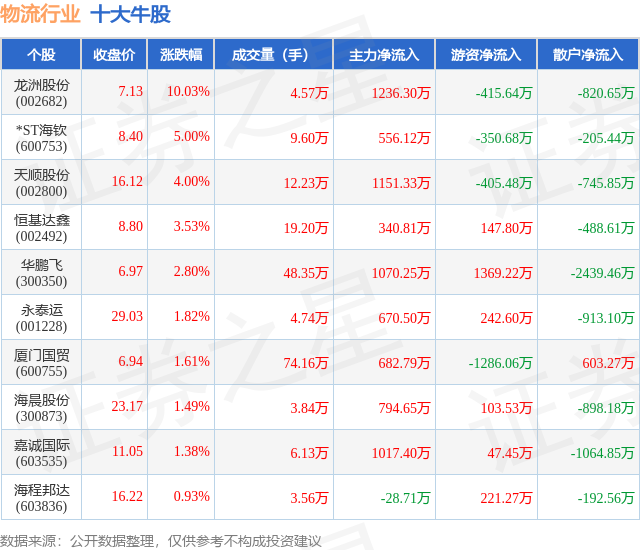 个股表现方面,物流行业当日领涨股为龙洲股份(002682),该股当日报收7.13,上涨10.03%,成交量4.57万,主力资金净流入1236.3万元。*ST海钦(600753)以上涨5.0%紧随其后,该股当日成交量9.6万,主力资金净流入556.12万元。除此之外,天顺股份(002800)、恒基达鑫(002492)、华鹏飞(300350)均进入当日牛股之列。具体个股列表见下表: