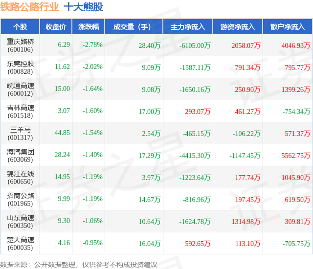 个股表现方面,铁路公路行业当日领跌股为重庆路桥(600106),该股当日报收6.29,下跌2.78%,成交量28.4万,主力资金净流出6105.0万元。东莞控股(000828)以下跌2.02%紧随其后,该股当日成交量9.09万,主力资金净流出1587.11万元。除此之外,皖通高速(600012)、吉林高速(601518)、三羊马(001317)均进入当日熊股之列。具体个股列表见下表:
