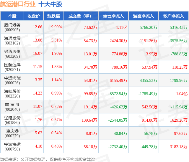 个股表现方面,航运港口行业当日领涨股为厦门港务(000905),该股当日报收12.66,上涨9.99%,成交量73.62万,主力资金净流入1.11亿元。海通发展(603162)以上涨5.31%紧随其后,该股当日成交量54.73万,主力资金净流入2424.3万元。除此之外,兴通股份(603209)、国航远洋(920571)、中远海能(600026)均进入当日牛股之列。具体个股列表见下表:
