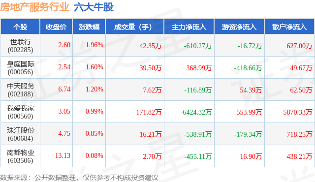 个股表现方面,房地产服务行业当日领涨股为世联行(002285),该股当日报收2.6,上涨1.96%,成交量42.35万,主力资金净流出610.27万元。皇庭国际(000056)以上涨1.6%紧随其后,该股当日成交量39.5万,主力资金净流入368.99万元。除此之外,中天服务(002188)、我爱我家(000560)、珠江股份(600684)均进入当日牛股之列。具体个股列表见下表: