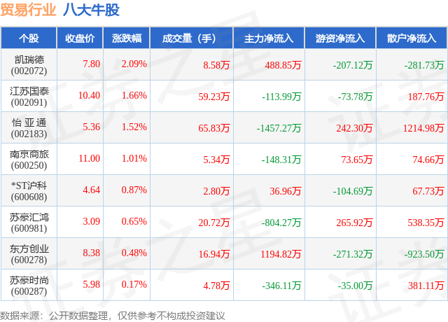 个股表现方面,贸易行业当日领涨股为凯瑞德(002072),该股当日报收7.8,上涨2.09%,成交量8.58万,主力资金净流入488.85万元。江苏国泰(002091)以上涨1.66%紧随其后,该股当日成交量59.23万,主力资金净流出113.99万元。除此之外,怡 亚 通(002183)、南京商旅(600250)、*ST沪科(600608)均进入当日牛股之列。具体个股列表见下表: