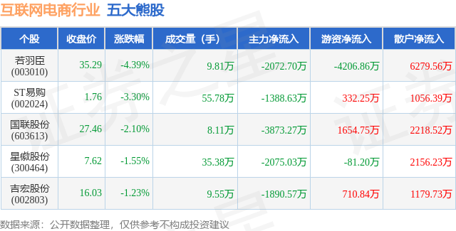个股表现方面,互联网电商行业当日领跌股为若羽臣(003010),该股当日报收35.29,下跌4.39%,成交量9.81万,主力资金净流出2072.7万元。ST易购(002024)以下跌3.3%紧随其后,该股当日成交量55.78万,主力资金净流出1388.63万元。除此之外,国联股份(603613)、星徽股份(300464)、吉宏股份(002803)均进入当日熊股之列。具体个股列表见下表: