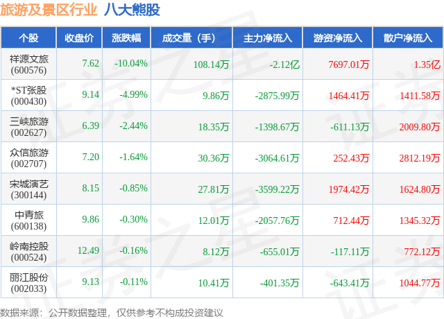 个股表现方面,旅游及景区行业当日领跌股为祥源文旅(600576),该股当日报收7.62,下跌10.04%,成交量108.14万,主力资金净流出2.12亿元。*ST张股(000430)以下跌4.99%紧随其后,该股当日成交量9.86万,主力资金净流出2875.99万元。除此之外,三峡旅游(002627)、众信旅游(002707)、宋城演艺(300144)均进入当日熊股之列。具体个股列表见下表: