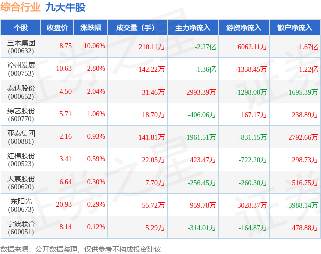 个股表现方面,综合行业当日领涨股为三木集团(000632),该股当日报收8.75,上涨10.06%,成交量210.11万,主力资金净流出2.27亿元。漳州发展(000753)以上涨2.8%紧随其后,该股当日成交量142.22万,主力资金净流出1.36亿元。除此之外,泰达股份(000652)、综艺股份(600770)、亚泰集团(600881)均进入当日牛股之列。具体个股列表见下表: