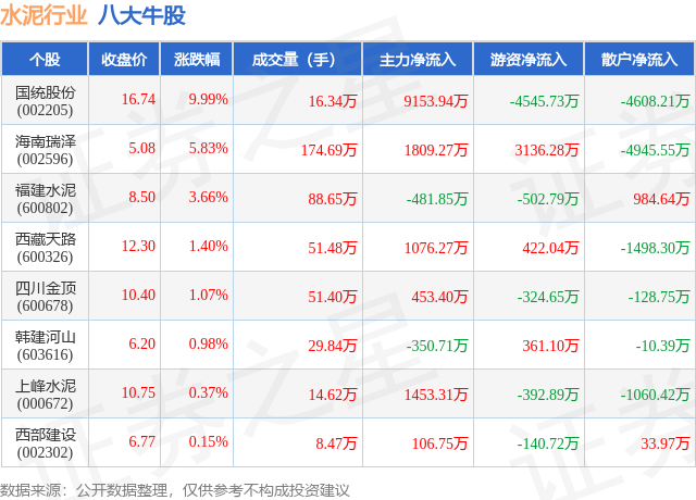 个股表现方面,水泥行业当日领涨股为国统股份(002205),该股当日报收16.74,上涨9.99%,成交量16.34万,主力资金净流入9153.94万元。海南瑞泽(002596)以上涨5.83%紧随其后,该股当日成交量174.69万,主力资金净流入1809.27万元。除此之外,福建水泥(600802)、西藏天路(600326)、四川金顶(600678)均进入当日牛股之列。具体个股列表见下表: