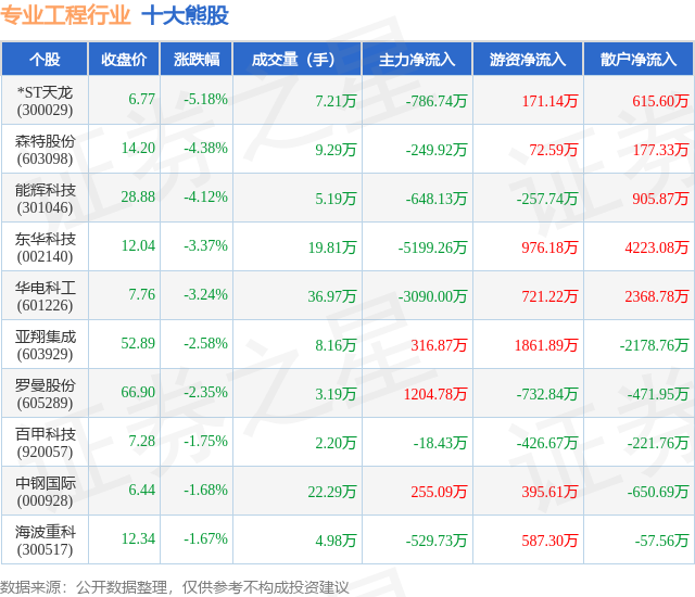 个股表现方面,专业工程行业当日领跌股为*ST天龙(300029),该股当日报收6.77,下跌5.18%,成交量7.21万,主力资金净流出786.74万元。森特股份(603098)以下跌4.38%紧随其后,该股当日成交量9.29万,主力资金净流出249.92万元。除此之外,能辉科技(301046)、东华科技(002140)、华电科工(601226)均进入当日熊股之列。具体个股列表见下表: