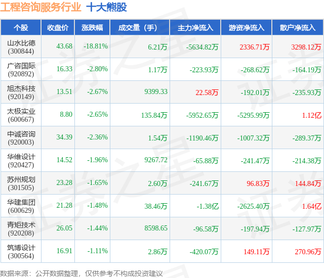 个股表现方面,工程咨询服务行业当日领跌股为山水比德(300844),该股当日报收43.68,下跌18.81%,成交量6.21万,主力资金净流出5634.82万元。广咨国际(920892)以下跌2.8%紧随其后,该股当日成交量1.17万,主力资金净流出223.93万元。除此之外,旭杰科技(920149)、太极实业(600667)、中诚咨询(920003)均进入当日熊股之列。具体个股列表见下表: