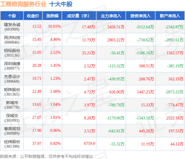 个股表现方面,工程咨询服务行业当日领涨股为建发合诚(603909),该股当日报收13.52,上涨10.01%,成交量17.48万,主力资金净流入5456.51万元。同济科技(600846)以上涨4.46%紧随其后,该股当日成交量11.79万,主力资金净流入2803.22万元。除此之外,招标股份(301136)、深圳瑞捷(300977)、杰恩设计(300668)均进入当日牛股之列。具体个股列表见下表: