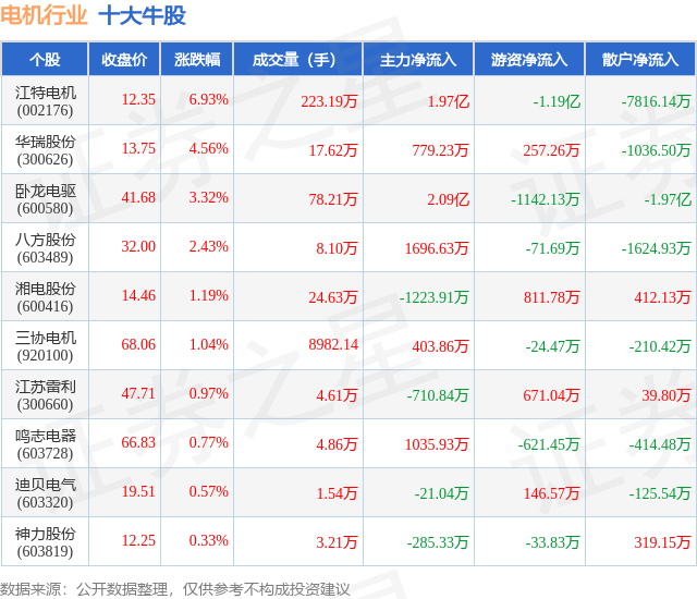 个股表现方面,电机行业当日领涨股为江特电机(002176),该股当日报收12.35,上涨6.93%,成交量223.19万,主力资金净流入1.97亿元。华瑞股份(300626)以上涨4.56%紧随其后,该股当日成交量17.62万,主力资金净流入779.23万元。除此之外,卧龙电驱(600580)、八方股份(603489)、湘电股份(600416)均进入当日牛股之列。具体个股列表见下表: