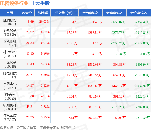 个股表现方面,电网设备行业当日领涨股为红相股份(300427),该股当日报收8.69,上涨20.03%,成交量96.31万,主力资金净流入1.4亿元。洛凯股份(603829)以上涨10.02%紧随其后,该股当日成交量15.23万,主力资金净流入4283.54万元。除此之外,泰永长征(002927)、精达股份(600577)、中元股份(300018)均进入当日牛股之列。具体个股列表见下表: