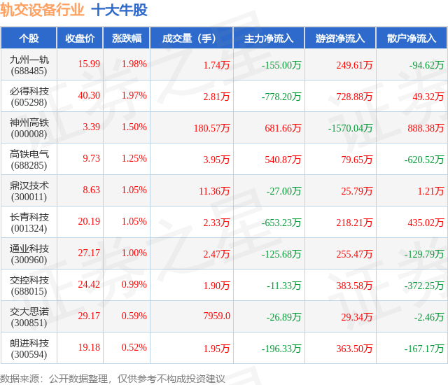 个股表现方面,轨交设备行业当日领涨股为九州一轨(688485),该股当日报收15.99,上涨1.98%,成交量1.74万,主力资金净流出155.0万元。必得科技(605298)以上涨1.97%紧随其后,该股当日成交量2.81万,主力资金净流出778.2万元。除此之外,神州高铁(000008)、高铁电气(688285)、鼎汉技术(300011)均进入当日牛股之列。具体个股列表见下表: