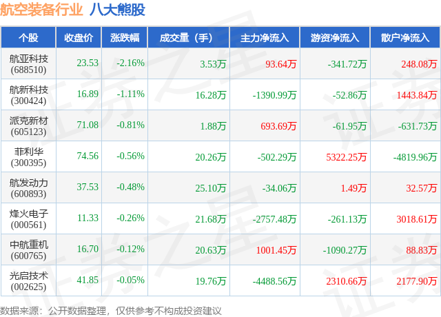 个股表现方面,航空装备行业当日领跌股为航亚科技(688510),该股当日报收23.53,下跌2.16%,成交量3.53万,主力资金净流入93.64万元。航新科技(300424)以下跌1.11%紧随其后,该股当日成交量16.28万,主力资金净流出1390.99万元。除此之外,派克新材(605123)、菲利华(300395)、航发动力(600893)均进入当日熊股之列。具体个股列表见下表: