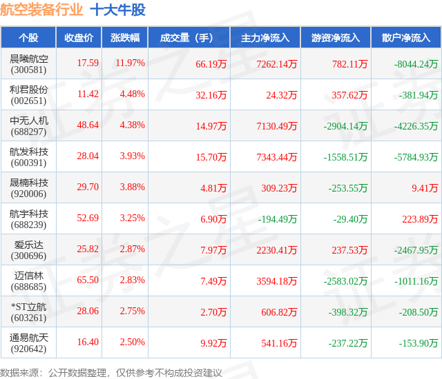 个股表现方面,航空装备行业当日领涨股为晨曦航空(300581),该股当日报收17.59,上涨11.97%,成交量66.19万,主力资金净流入7262.14万元。利君股份(002651)以上涨4.48%紧随其后,该股当日成交量32.16万,主力资金净流入24.32万元。除此之外,中无人机(688297)、航发科技(600391)、晟楠科技(920006)均进入当日牛股之列。具体个股列表见下表: