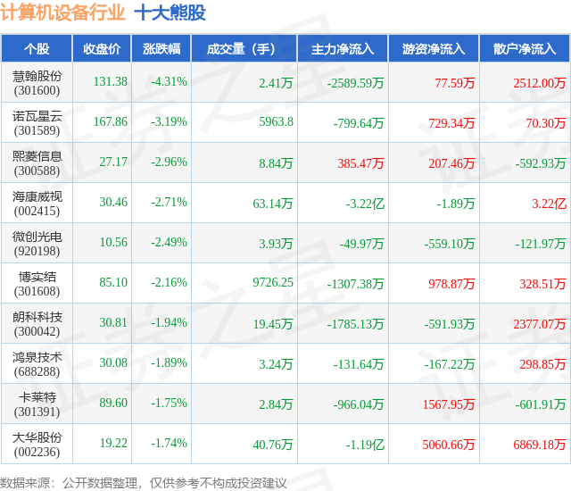 个股表现方面,计算机设备行业当日领跌股为慧翰股份(301600),该股当日报收131.38,下跌4.31%,成交量2.41万,主力资金净流出2589.59万元。诺瓦星云(301589)以下跌3.19%紧随其后,该股当日成交量5964.0,主力资金净流出799.64万元。除此之外,熙菱信息(300588)、海康威视(002415)、微创光电(920198)均进入当日熊股之列。具体个股列表见下表: