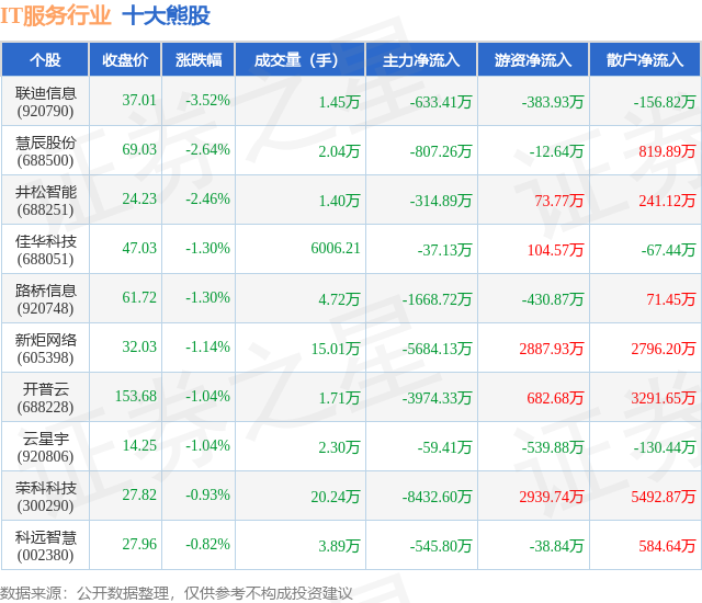 个股表现方面,IT服务行业当日领跌股为联迪信息(920790),该股当日报收37.01,下跌3.52%,成交量1.45万,主力资金净流出633.41万元。慧辰股份(688500)以下跌2.64%紧随其后,该股当日成交量2.04万,主力资金净流出807.26万元。除此之外,井松智能(688251)、佳华科技(688051)、路桥信息(920748)均进入当日熊股之列。具体个股列表见下表: