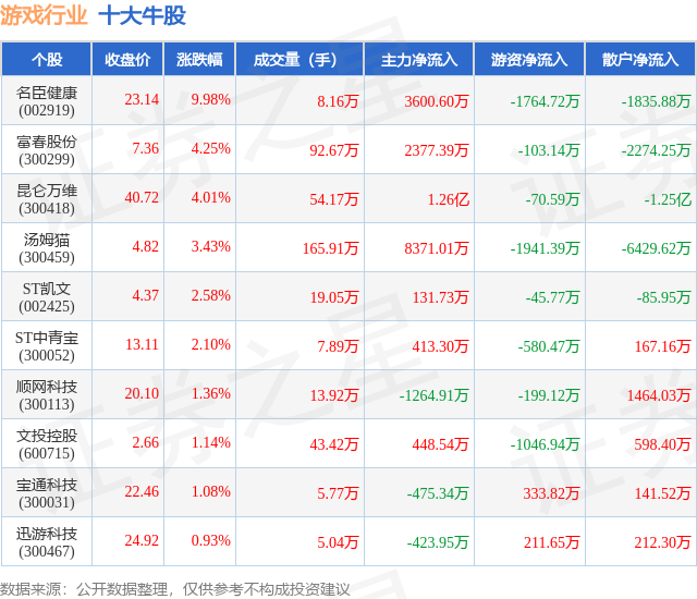 个股表现方面,游戏行业当日领涨股为名臣健康(002919),该股当日报收23.14,上涨9.98%,成交量8.16万,主力资金净流入3600.6万元。富春股份(300299)以上涨4.25%紧随其后,该股当日成交量92.67万,主力资金净流入2377.39万元。除此之外,昆仑万维(300418)、汤姆猫(300459)、ST凯文(002425)均进入当日牛股之列。具体个股列表见下表: