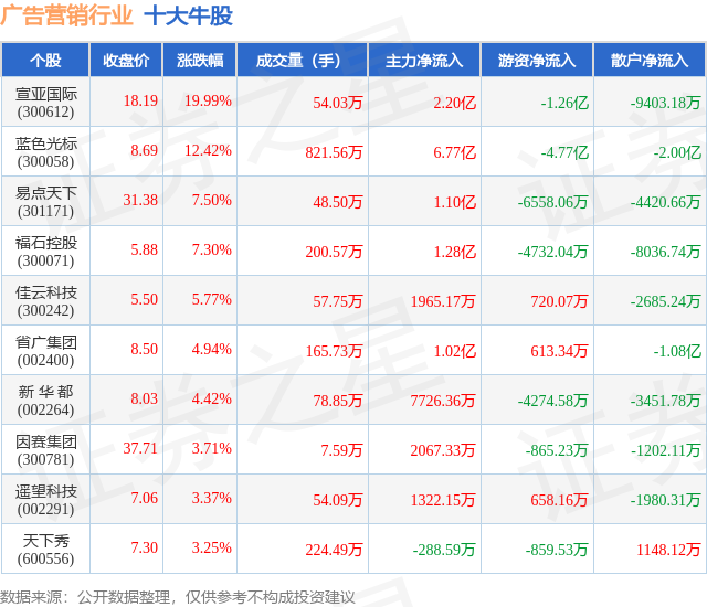 个股表现方面,广告营销行业当日领涨股为宣亚国际(300612),该股当日报收18.19,上涨19.99%,成交量54.03万,主力资金净流入2.2亿元。蓝色光标(300058)以上涨12.42%紧随其后,该股当日成交量821.56万,主力资金净流入6.77亿元。除此之外,易点天下(301171)、福石控股(300071)、佳云科技(300242)均进入当日牛股之列。具体个股列表见下表: