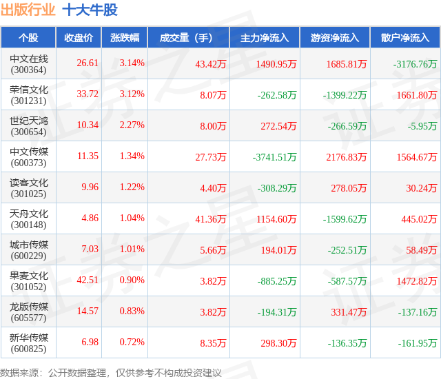 个股表现方面,出版行业当日领涨股为中文在线(300364),该股当日报收26.61,上涨3.14%,成交量43.42万,主力资金净流入1490.95万元。荣信文化(301231)以上涨3.12%紧随其后,该股当日成交量8.07万,主力资金净流出262.58万元。除此之外,世纪天鸿(300654)、中文传媒(600373)、读客文化(301025)均进入当日牛股之列。具体个股列表见下表:
